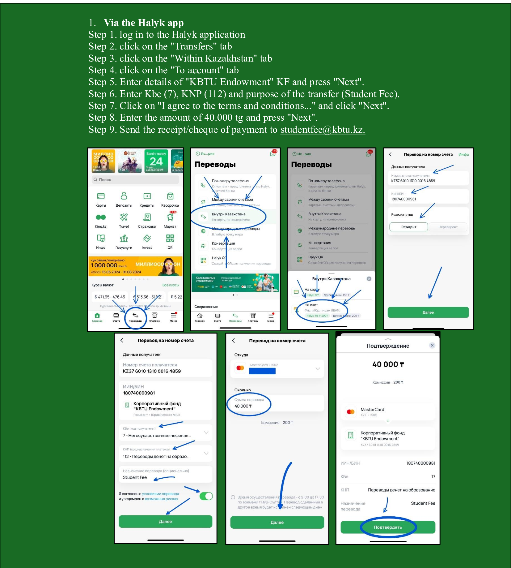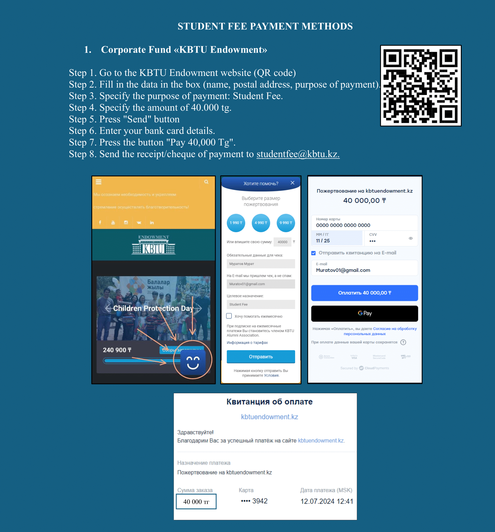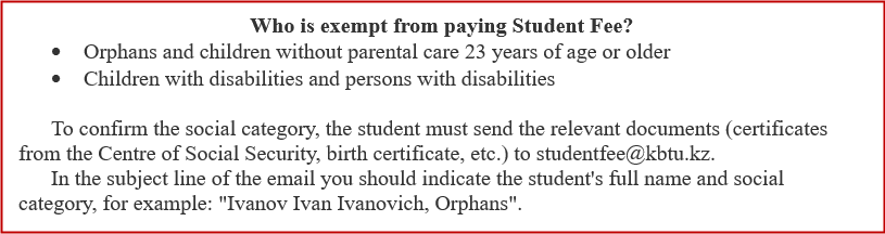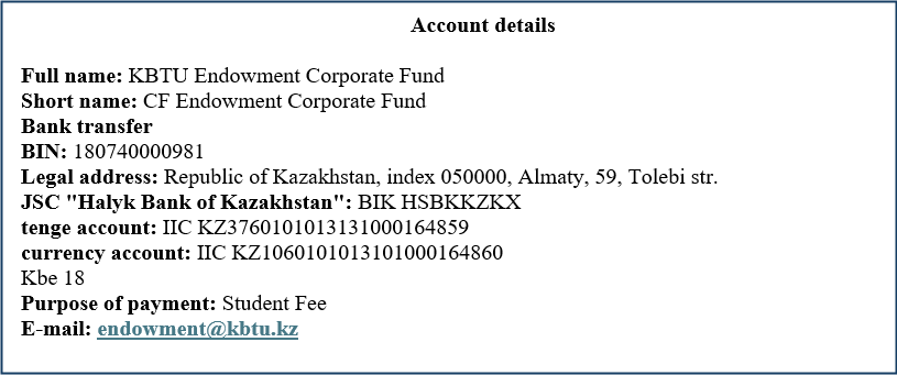 Thus, the Student Fee is paid by the student once at the moment of admission to the University until 2 September 2024 to the account of the Corporate Fund “KBTU Endowment” and is 40 000 tenge. The payment is non-refundable.