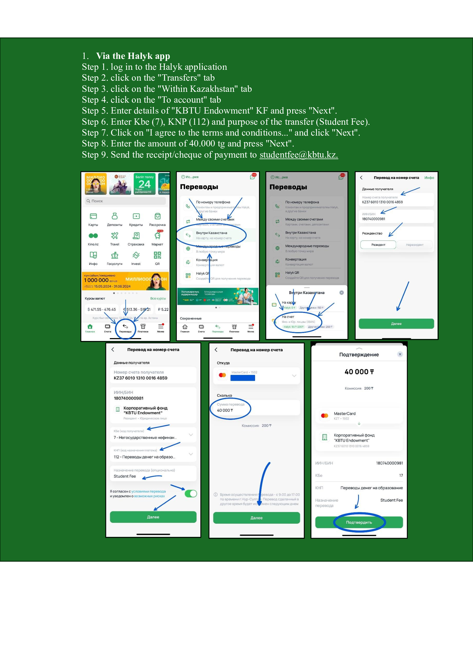 Thus, the Student Fee is paid by the student once at the moment of admission to the University until 2 September 2024 to the account of the Corporate Fund “KBTU Endowment” and is 40 000 tenge. The payment is non-refundable.